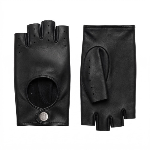 Black, fingerless gloves, unlined with a snap closure at the wrist.