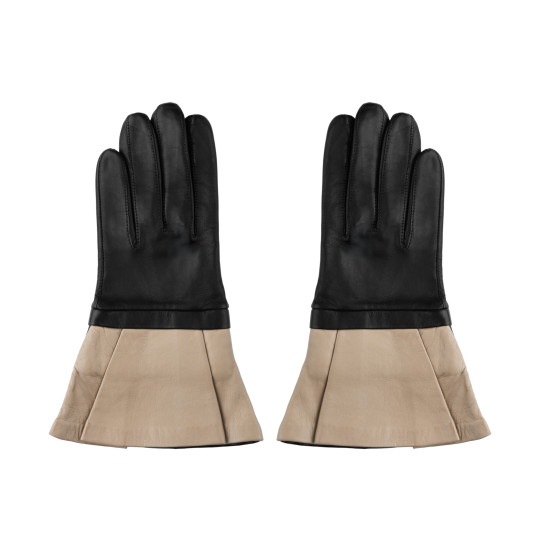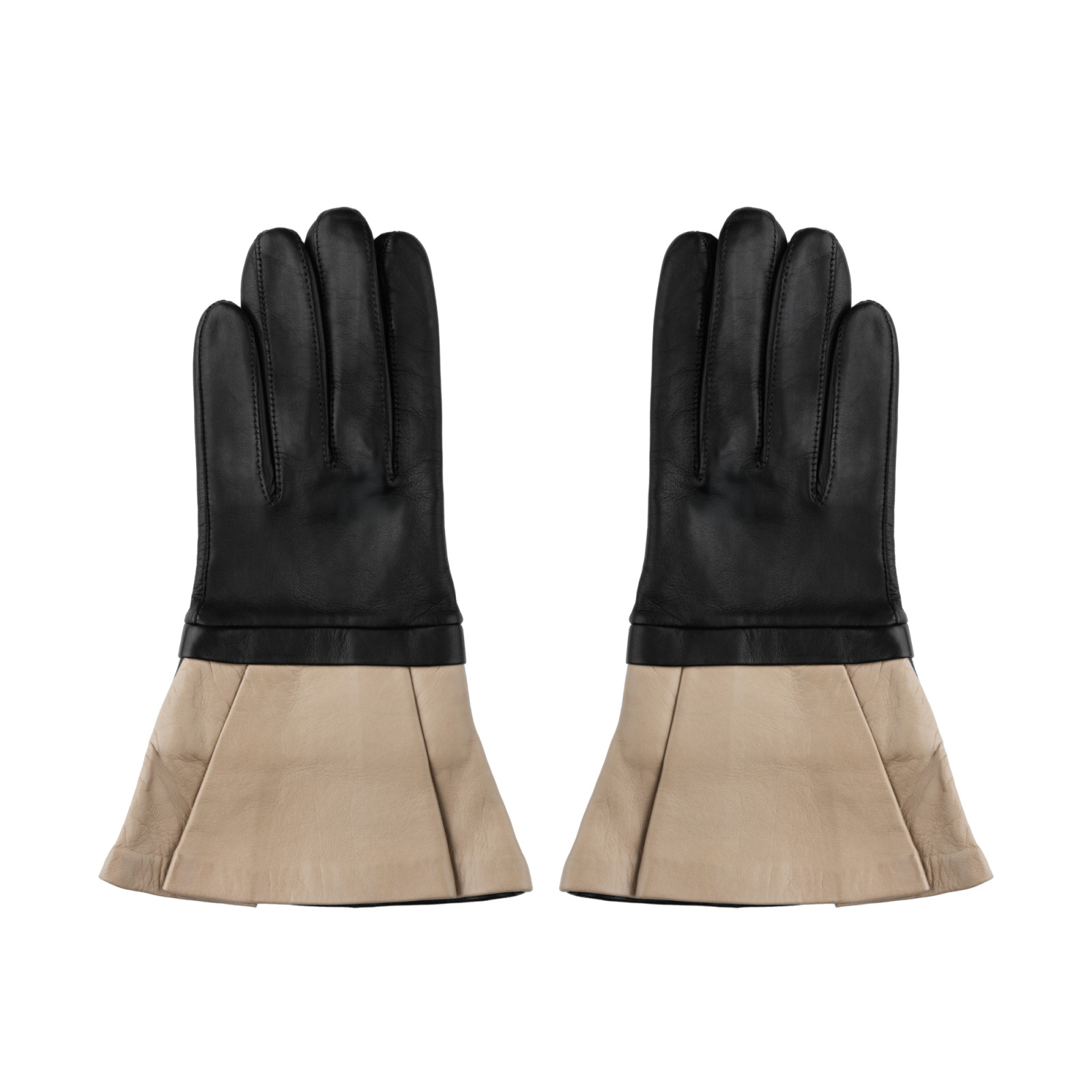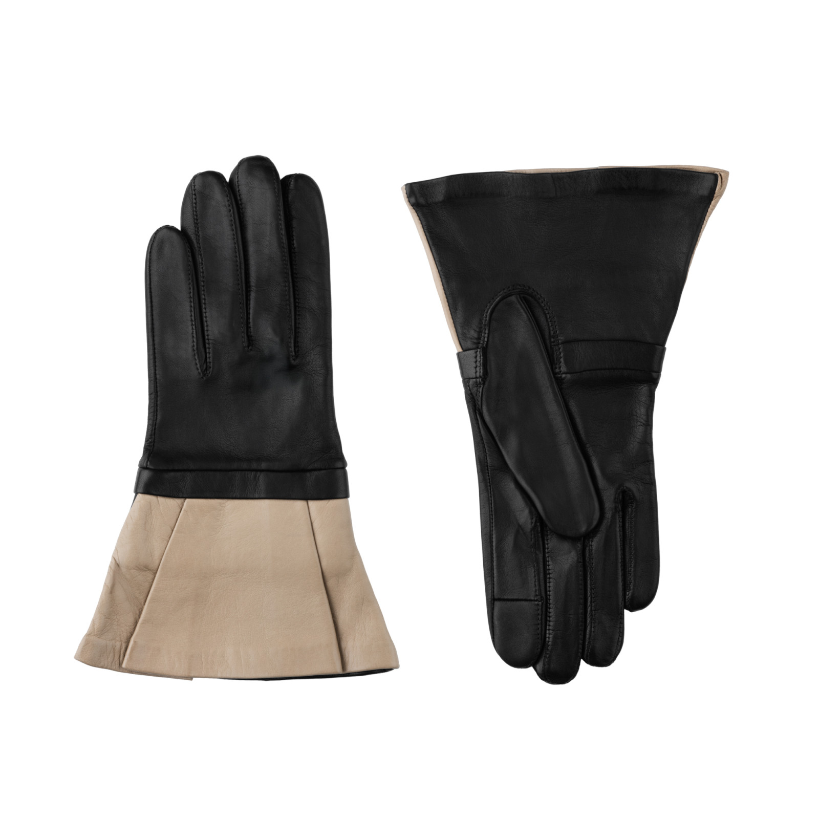 Women's gloves in 100% lambskin with a kiss on the top of one hand. Easy touch patches on the thumbs and index fingers for tactile screen use. 100% silk lining.