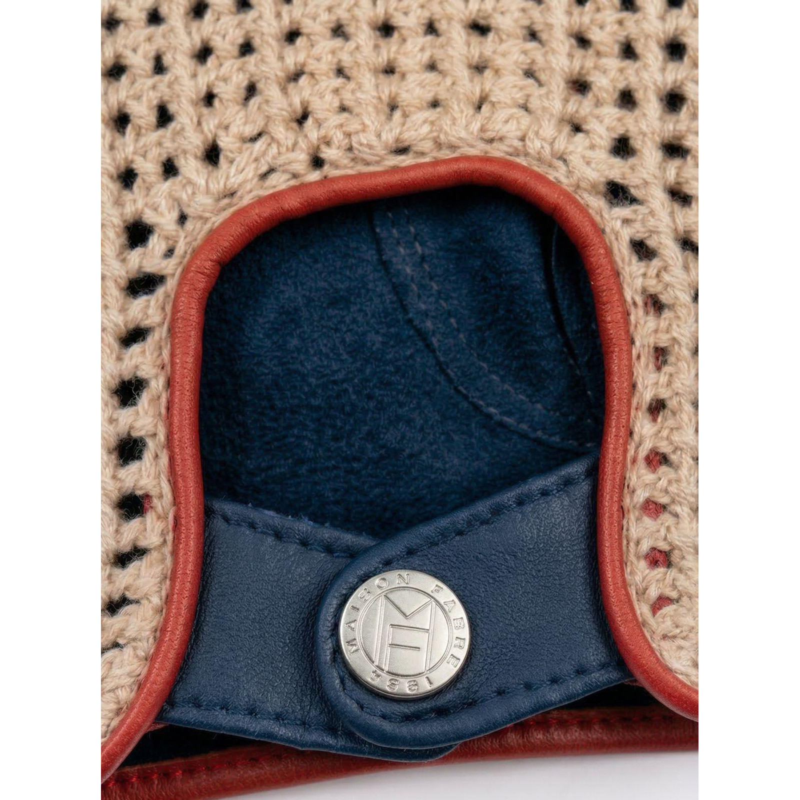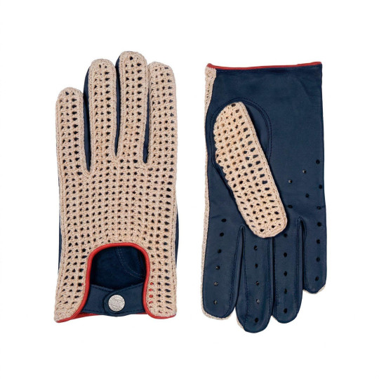 Men's fingerless gloves in 50% lambskin leather and 50% cotton crochet, snap closure, no lining.