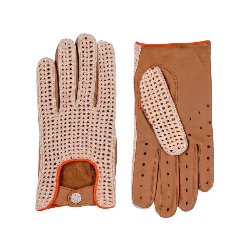 Gants homme 50% cuir d'agneau et 50% crochet coton, avec bouton pression, non doublées.