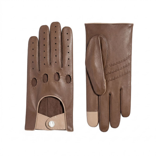 Gants de conduite bi-colore homme en cuir d'agneau, coutures en piquĂ© anglais, avec bouton pression Maison Fabre, non doublĂ©, pouces et index tactiles.Â