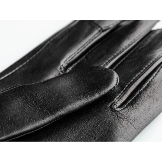 Gants homme en cuir d'agneau, en piqué anglais, 3 baguettes, bouton pression, doublés polaire, pouces et index tactiles.
