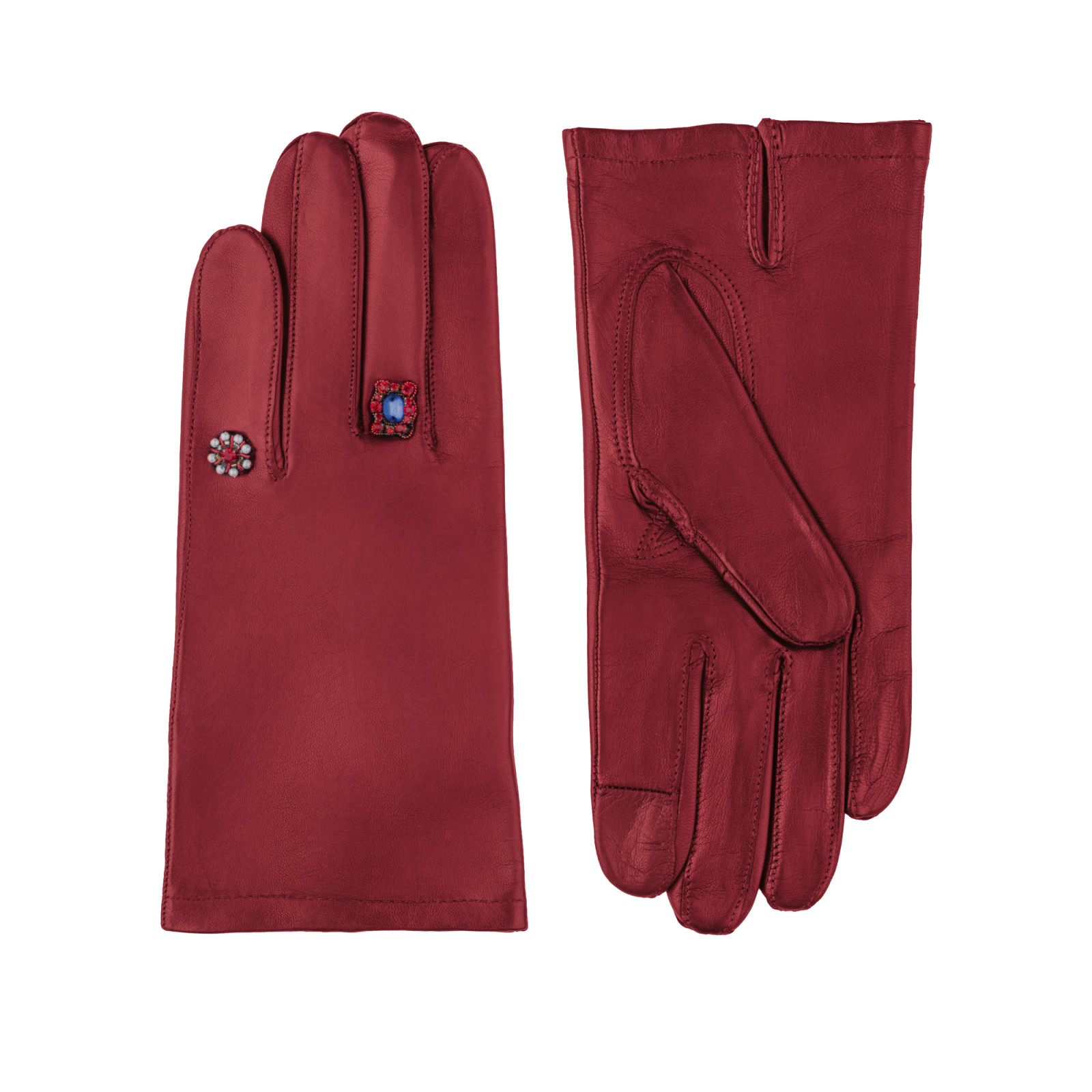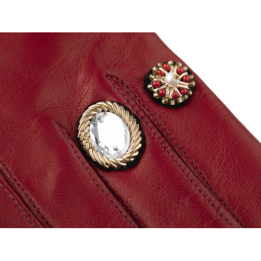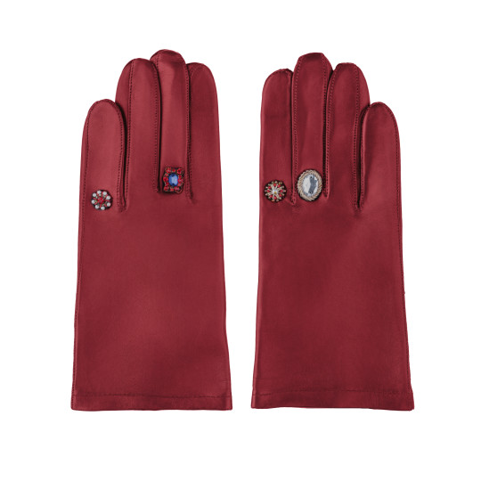 Gants femme en cuir d'agneau, empiècement en laine de brebis race Lacaune, piqué anglais, bord anglais de couleur, bouton pression, doublés cachemire. Fabriqué en Aveyron, Occitanie.