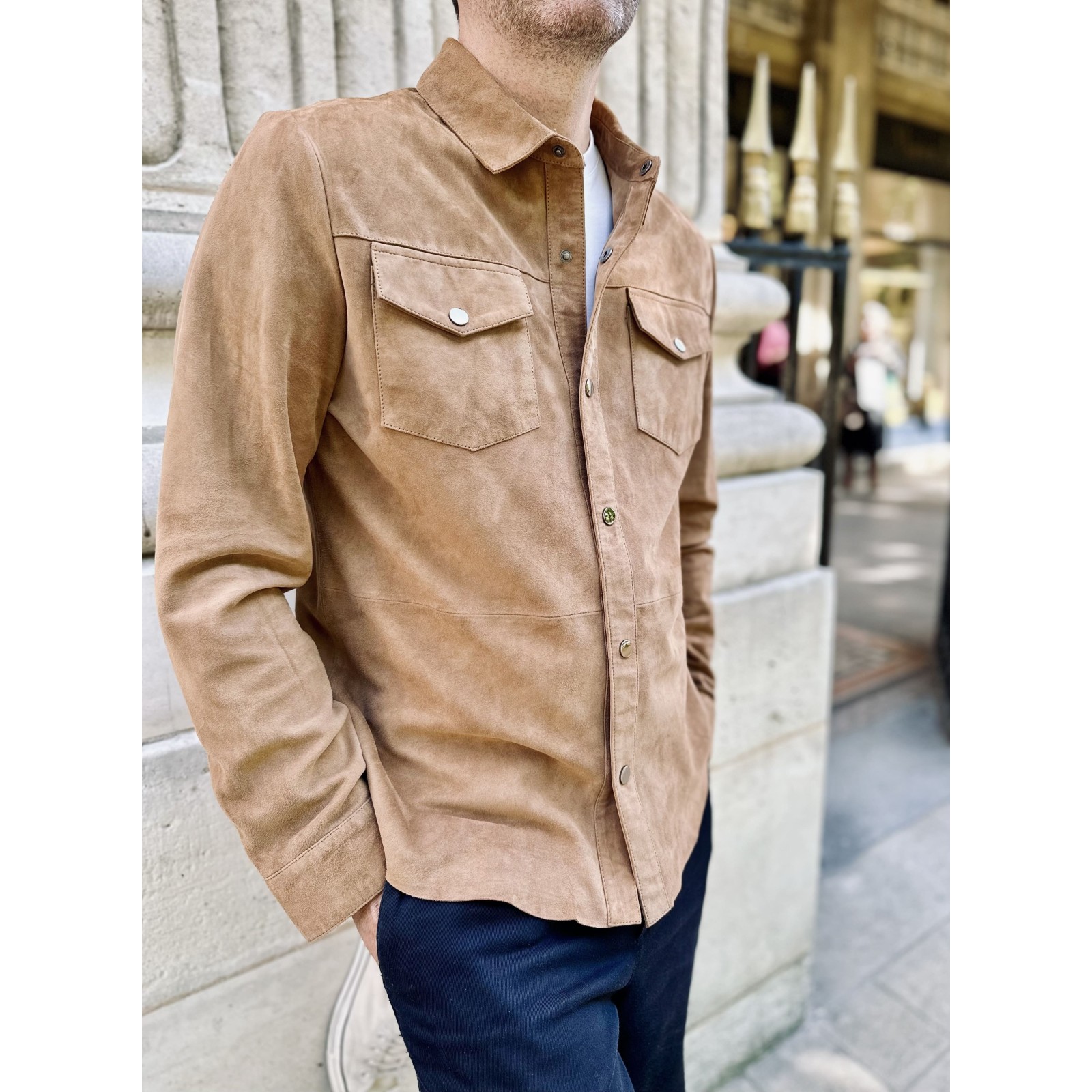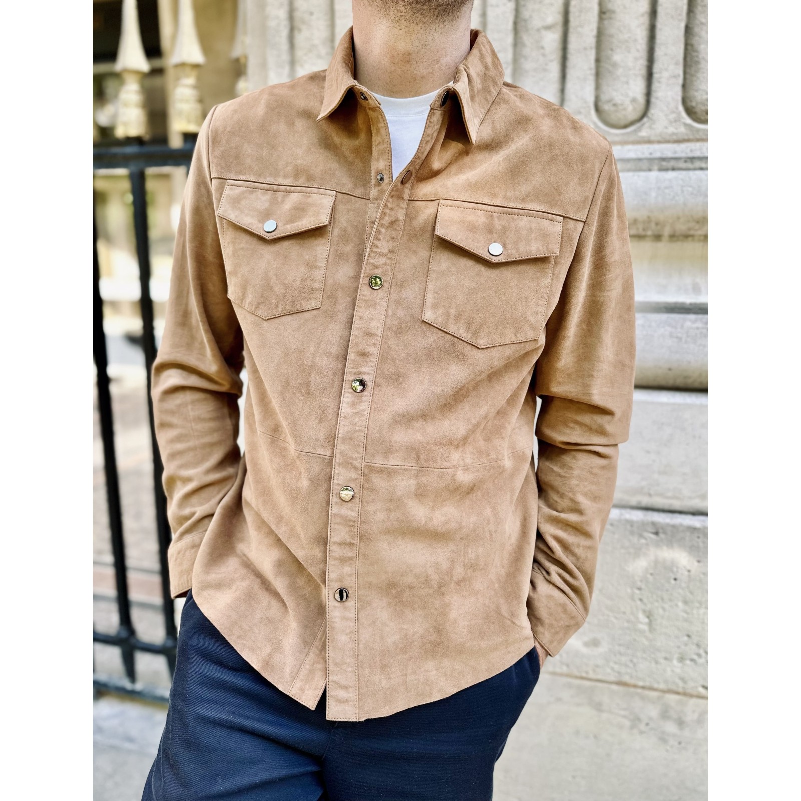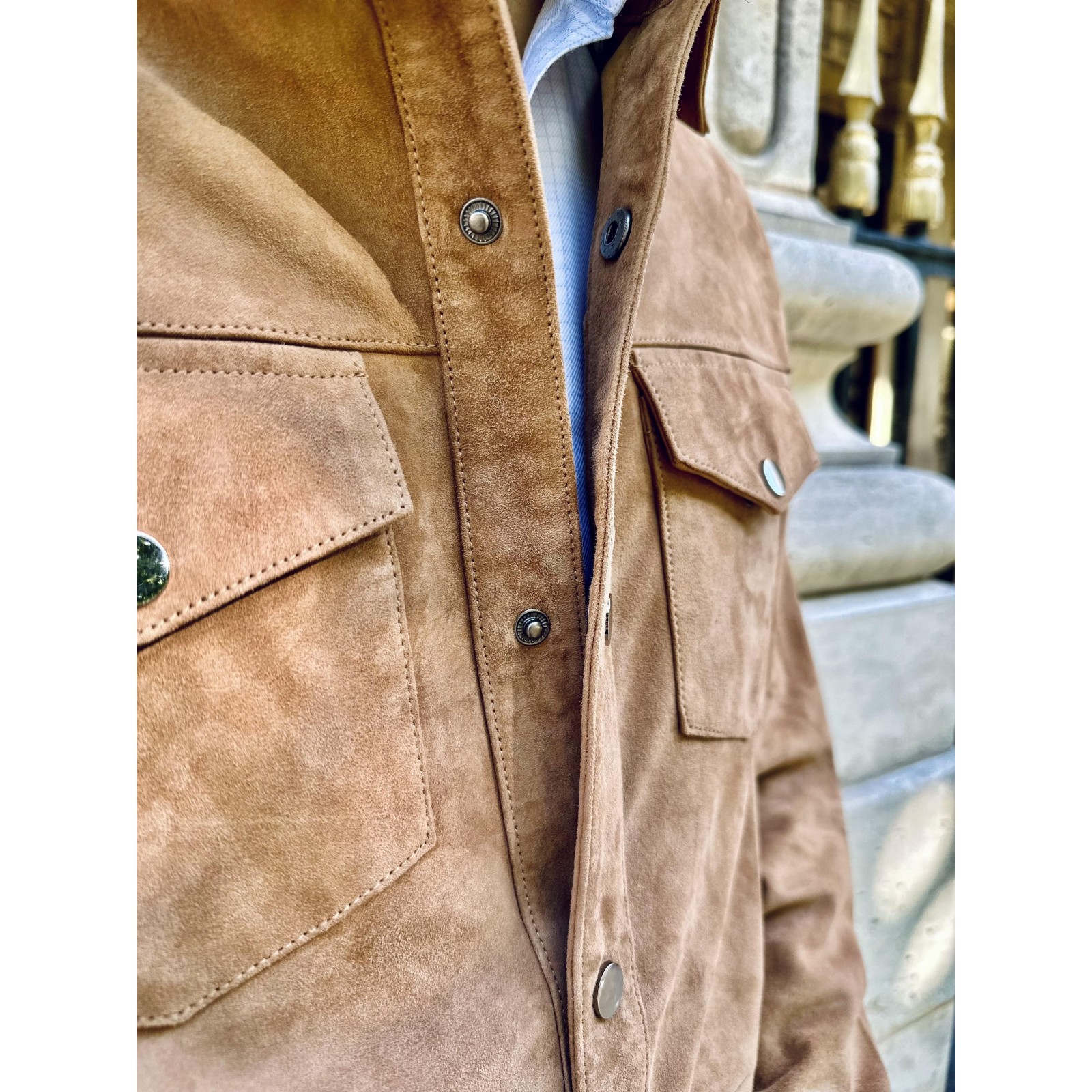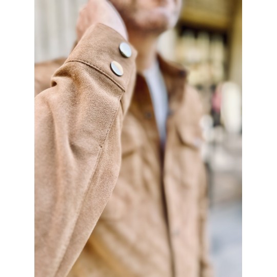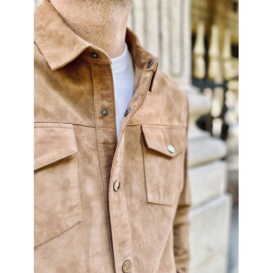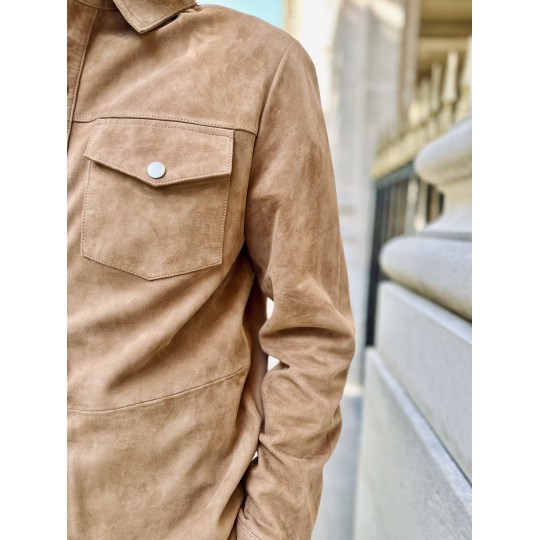 Fermeture : Six boutons pressions en métal, col chemise, chemise en chèvre velours non doublé.